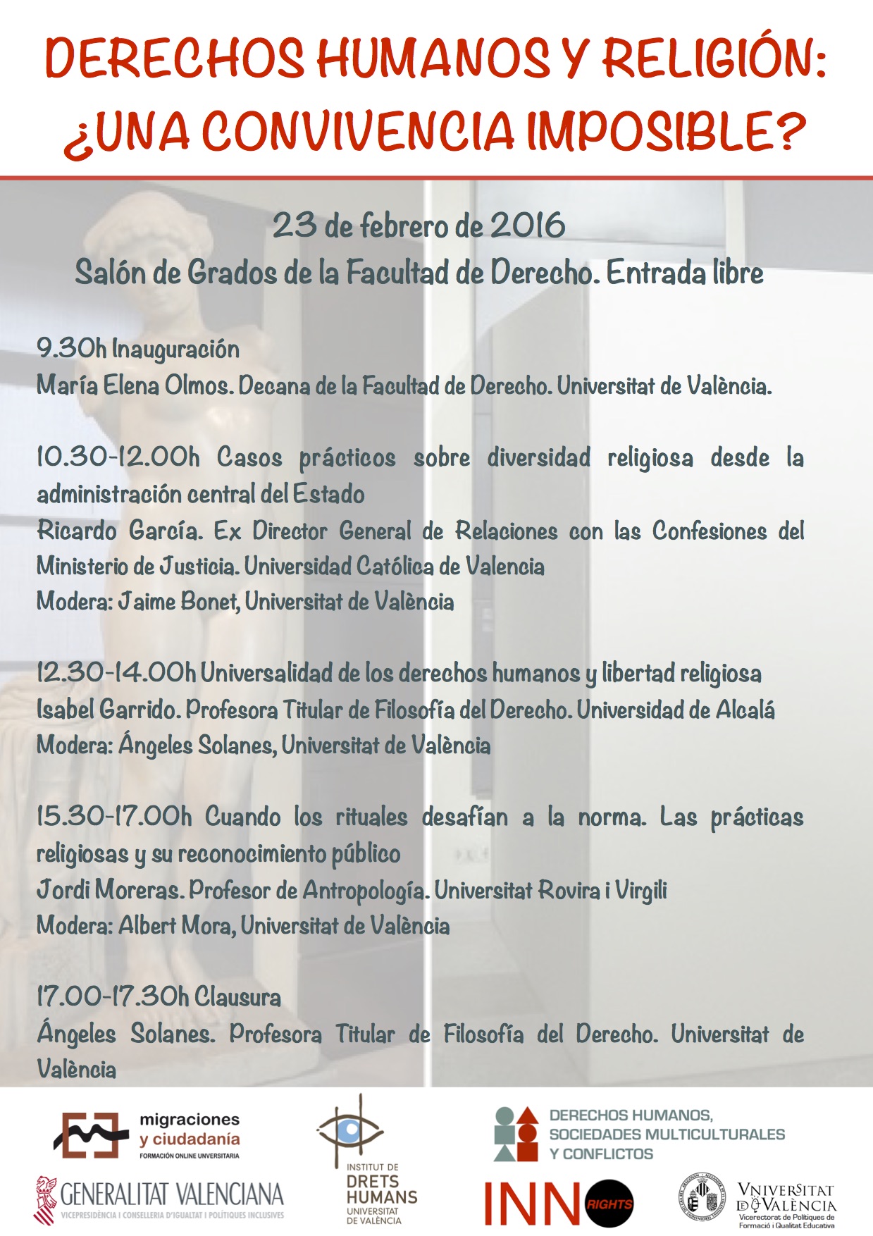 The relationship between human rights and religions has been an ongoing legal, political and social concern since the dawn of modernity. In recent years, a series of headlines have brought this issue to the fore, often with a focus on Muslim communities residing in Europe and surrounding regions. In a dissemination session entitled "Human rights and religion: an impossible coexistence?", which will be held at the Law Faculty of Valencia University on 23 February, several specialists will assess the current situation and its implications for the promotion of human rights. This activity is organized within the "Innorights" and "Human rights, multicultural societies and conflicts" projects, both coordinated by professor Ángeles Solanes at the Human Rights Institute.