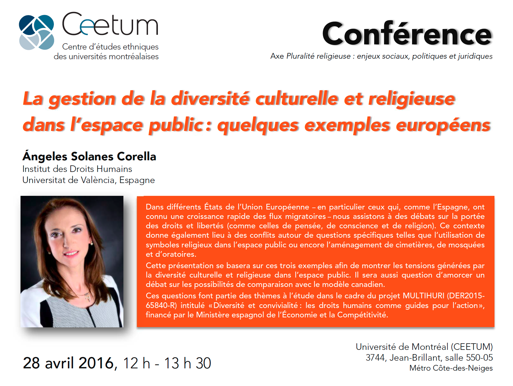 Ángeles Solanes, professor of Legal Philosophy at Valencia University and main investigator of the Multihuri project, will be at the University of Montreal (Centre d'études ethniques des universités montréalaises) to deliver a conference entitled "Managing cultural and religious diversity in public space: some European examples" on 28 April at 12:00. The presentation will analyse the debates currently being held in varios EU states on the fundamental rights of foreign nationals, the use of religious symbols in public space and the opening of cemeteries and places of worship. This activity is promoted by Pierre Bosset, an internationally recognised expert on culture-based reasonable accommodations, and will also examine some possibilities of comparison with the Canadian model of diversity management.